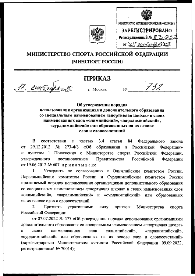 ПРИКАЗ Минспорта РФ от 17.09.2025 N 732