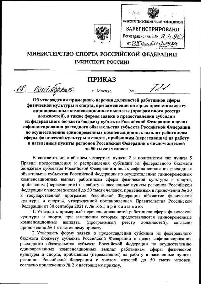 ПРИКАЗ Минспорта РФ от 16.09.2025 N 721