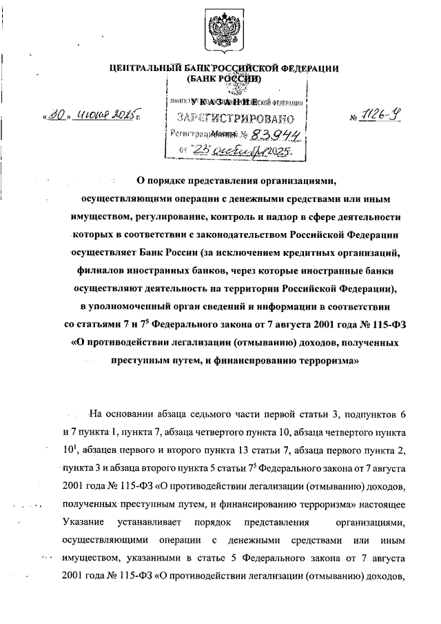 УКАЗАНИЕ ЦБ РФ от 30.06.2025 N 7126-У