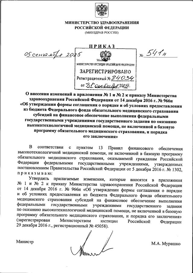 ПРИКАЗ Минздрава РФ от 05.09.2025 N 541н