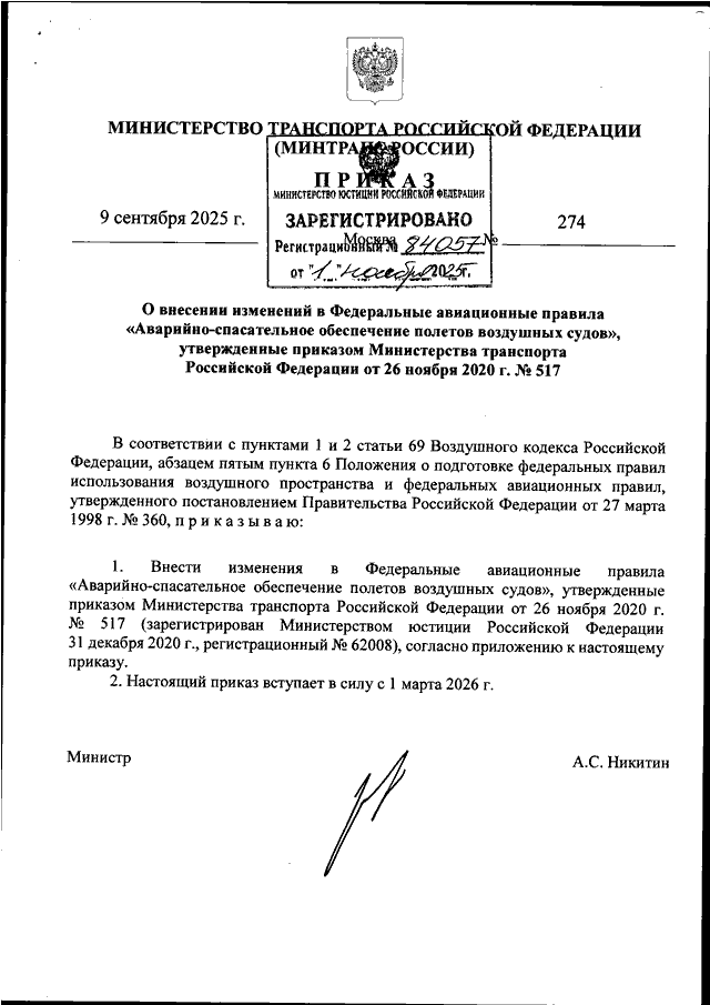 ПРИКАЗ Минтранса РФ от 09.09.2025 N 274