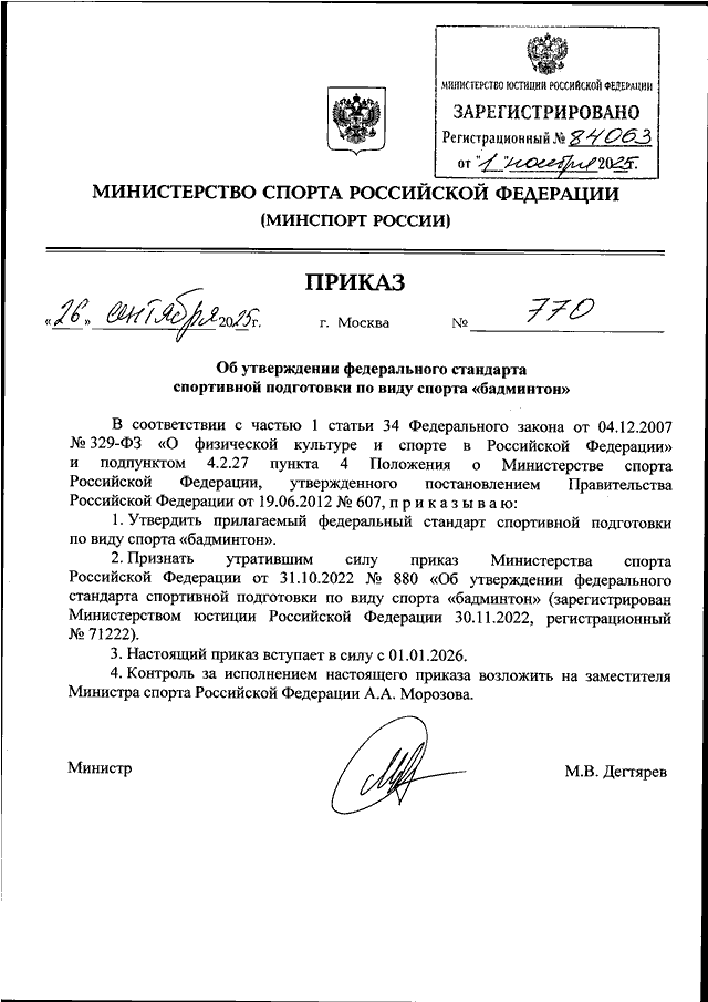 ПРИКАЗ Минспорта РФ от 26.09.2025 N 770
