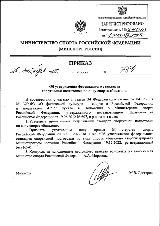 ПРИКАЗ Минспорта РФ от 26.09.2025 N 784