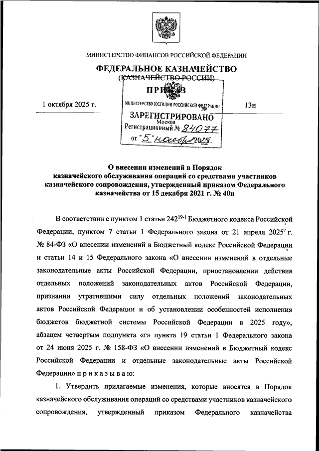 ПРИКАЗ Федерального казначейства от 01.10.2025 N 13н