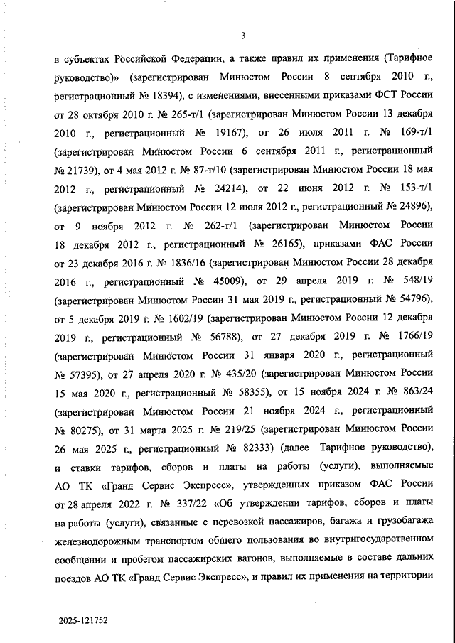 "ОБ ИНДЕКСАЦИИ СТАВОК ТАРИФОВ, СБОРОВ И ПЛАТЫ НА РАБОТЫ (УСЛУГИ), ВЫПОЛНЯЕМЫЕ ОАО "РОССИЙСКИЕ ЖЕЛЕЗНЫЕ ДОРОГИ", АО "ФЕДЕРАЛЬНАЯ ПАССАЖИРСКАЯ КОМПАНИЯ", АО "ПАССАЖИРСКАЯ КОМПАНИЯ "САХАЛИН", АО "АК "ЖЕЛЕЗНЫЕ ДОРОГИ ЯКУТИИ", УТВЕРЖДЕННЫХ ПРИКАЗОМ ФСТ РОССИИ ОТ 27 ИЮЛЯ 2010 Г. N 156-Т/1, А ТАКЖЕ ОБ ИНДЕКСАЦИИ СТАВОК ТАРИФОВ, СБОРОВ И ПЛАТЫ НА РАБОТЫ (УСЛУГИ), ВЫПОЛНЯЕМЫЕ АО ТК "ГРАНД СЕРВИС ЭКСПРЕСС", УТВЕРЖДЕННЫХ ПРИКАЗОМ ФАС РОССИИ ОТ 28 АПРЕЛЯ 2022 Г. N 337/22, И УСТАНОВЛЕНИИ ПРЕДЕЛЬНОГО МАКСИМАЛЬНОГО ИНДЕКСА К УРОВНЮ ТАРИФОВ НА ПЕРЕВОЗКИ ПАССАЖИРОВ ЖЕЛЕЗНОДОРОЖНЫМ ТРАНСПОРТОМ ОБЩЕГО ПОЛЬЗОВАЛСЯ ВО ВНУТРИГОСУДАРСТВЕННОМ СООБЩЕНИИ В СОСТАВЕ ПОЕЗДОВ ДАЛЬНЕГО СЛЕДОВАНИЯ АО "ФЕДЕРАЛЬНАЯ ПАССАЖИРСКАЯ КОМПАНИЯ", АО ТК "ГРАНД СЕРВИС ЭКСПРЕСС"