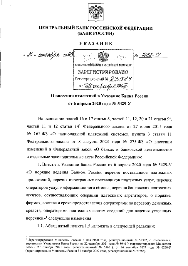 УКАЗАНИЕ ЦБ РФ от 24.09.2025 N 7182-У