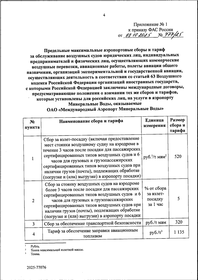"ОБ УТВЕРЖДЕНИИ ПРЕДЕЛЬНЫХ МАКСИМАЛЬНЫХ АЭРОПОРТОВЫХ СБОРОВ И ТАРИФА ЗА ОБСЛУЖИВАНИЕ ВОЗДУШНЫХ СУДОВ ЮРИДИЧЕСКИХ ЛИЦ, ИНДИВИДУАЛЬНЫХ ПРЕДПРИНИМАТЕЛЕЙ И ФИЗИЧЕСКИХ ЛИЦ, ОСУЩЕСТВЛЯЮЩИХ КОММЕРЧЕСКИЕ ВОЗДУШНЫЕ ПЕРЕВОЗКИ, АВИАЦИОННЫЕ РАБОТЫ, ПОЛЕТЫ АВИАЦИИ ОБЩЕГО НАЗНАЧЕНИЯ, ОРГАНИЗАЦИЙ ЭКСПЕРИМЕНТАЛЬНОЙ И ГОСУДАРСТВЕННОЙ АВИАЦИИ, ОСУЩЕСТВЛЯЮЩИХ ДЕЯТЕЛЬНОСТЬ В СООТВЕТСТВИИ СО СТАТЬЕЙ 63 ВОЗДУШНОГО КОДЕКСА РОССИЙСКОЙ ФЕДЕРАЦИИ ОРГАНИЗАЦИЙ ИНОСТРАННЫХ ГОСУДАРСТВ, С КОТОРЫМИ РОССИЙСКОЙ ФЕДЕРАЦИЕЙ ЗАКЛЮЧЕНЫ МЕЖДУНАРОДНЫЕ ДОГОВОРЫ, ПРЕДУСМАТРИВАЮЩИЕ ПОЛОЖЕНИЯ О ВЗИМАНИИ ТЕХ ЖЕ СБОРОВ И ТАРИФОВ, КОТОРЫЕ УСТАНОВЛЕНЫ ДЛЯ РОССИЙСКИХ ЛИЦ, И ПРЕДЕЛЬНЫХ МАКСИМАЛЬНЫХ АЭРОПОРТОВЫХ СБОРОВ ЗА ОБСЛУЖИВАНИЕ ВОЗДУШНЫХ СУДОВ ОСУЩЕСТВЛЯЮЩИХ ДЕЯТЕЛЬНОСТЬ В СООТВЕТСТВИИ СО СТАТЬЕЙ 63 ВОЗДУШНОГО КОДЕКСА РОССИЙСКОЙ ФЕДЕРАЦИИ ОРГАНИЗАЦИЙ ИНОСТРАННЫХ ГОСУДАРСТВ, С КОТОРЫМИ У РОССИЙСКОЙ ФЕДЕРАЦИИ ОТСУТСТВУЮТ ЗАКЛЮЧЕННЫЕ МЕЖДУНАРОДНЫЕ ДОГОВОРЫ, ПРЕДУСМАТРИВАЮЩИЕ ПОЛОЖЕНИЯ О ВЗИМАНИИ ТЕХ ЖЕ СБОРОВ, КОТОРЫЕ УСТАНОВЛЕНЫ ДЛЯ РОССИЙСКИХ ЛИЦ, НА УСЛУГИ В АЭРОПОРТУ МИНЕРАЛЬНЫЕ ВОДЫ, ОКАЗЫВАЕМЫЕ ОАО "МЕЖДУНАРОДНЫЙ АЭРОПОРТ МИНЕРАЛЬНЫЕ ВОДЫ"