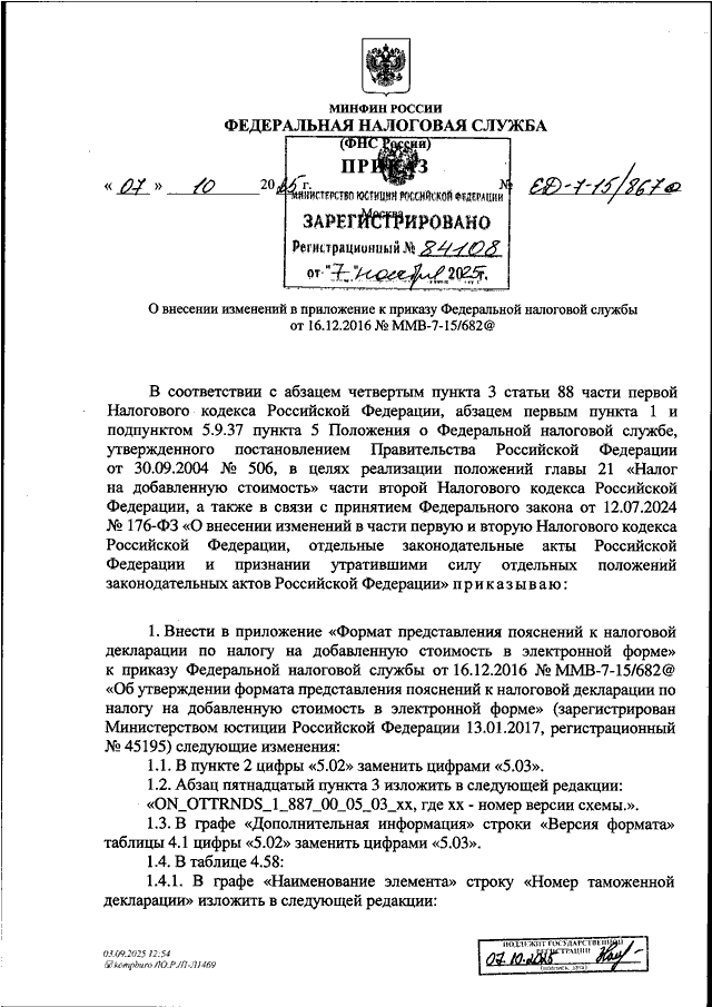 ПРИКАЗ ФНС РФ от 07.10.2025 N ЕД-7-15/867@