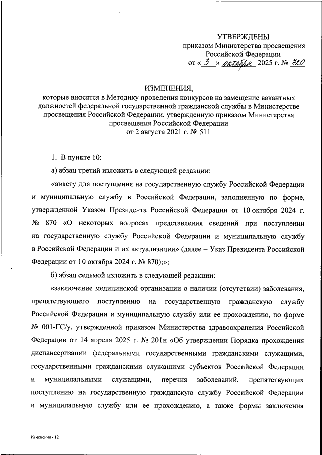 "О ВНЕСЕНИИ ИЗМЕНЕНИЙ В МЕТОДИКУ ПРОВЕДЕНИЯ КОНКУРСОВ НА ЗАМЕЩЕНИЕ ВАКАНТНЫХ ДОЛЖНОСТЕЙ ФЕДЕРАЛЬНОЙ ГОСУДАРСТВЕННОЙ ГРАЖДАНСКОЙ СЛУЖБЫ В МИНИСТЕРСТВЕ ПРОСВЕЩЕНИЯ РОССИЙСКОЙ ФЕДЕРАЦИИ, УТВЕРЖДЕННУЮ ПРИКАЗОМ МИНИСТЕРСТВА ПРОСВЕЩЕНИЯ РОССИЙСКОЙ ФЕДЕРАЦИИ ОТ 2 АВГУСТА 2021 Г. N 511"