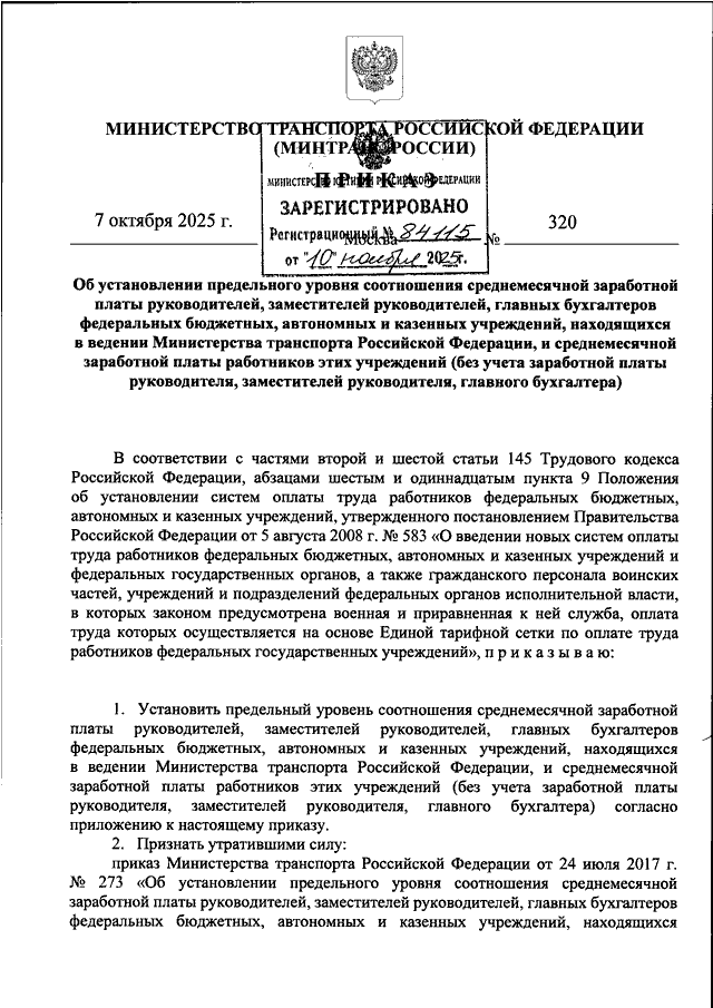 ПРИКАЗ Минтранса РФ от 07.10.2025 N 320
