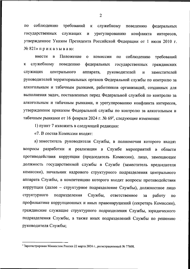 "О ВНЕСЕНИИ ИЗМЕНЕНИЙ В ПОЛОЖЕНИЕ О КОМИССИИ ПО СОБЛЮДЕНИЮ ТРЕБОВАНИЙ К СЛУЖЕБНОМУ ПОВЕДЕНИЮ ФЕДЕРАЛЬНЫХ ГОСУДАРСТВЕННЫХ ГРАЖДАНСКИХ СЛУЖАЩИХ ЦЕНТРАЛЬНОГО АППАРАТА, РУКОВОДИТЕЛЕЙ И ЗАМЕСТИТЕЛЕЙ РУКОВОДИТЕЛЕЙ ТЕРРИТОРИАЛЬНЫХ ОРГАНОВ ФЕДЕРАЛЬНОЙ СЛУЖБЫ ПО КОНТРОЛЮ ЗА АЛКОГОЛЬНЫМ И ТАБАЧНЫМ РЫНКАМИ, РАБОТНИКОВ ОРГАНИЗАЦИЙ, СОЗДАННЫХ ДЛЯ ВЫПОЛНЕНИЯ ЗАДАЧ, ПОСТАВЛЕННЫХ ПЕРЕД ФЕДЕРАЛЬНОЙ СЛУЖБОЙ ПО КОНТРОЛЮ ЗА АЛКОГОЛЬНЫМ И ТАБАЧНЫМ РЫНКАМИ, И УРЕГУЛИРОВАНИЮ КОНФЛИКТА ИНТЕРЕСОВ, УТВЕРЖДЕННОЕ ПРИКАЗОМ ФЕДЕРАЛЬНОЙ СЛУЖБЫ ПО КОНТРОЛЮ ЗА АЛКОГОЛЬНЫМ И ТАБАЧНЫМ РЫНКАМИ ОТ 16 ФЕВРАЛЯ 2024 Г. N 69"