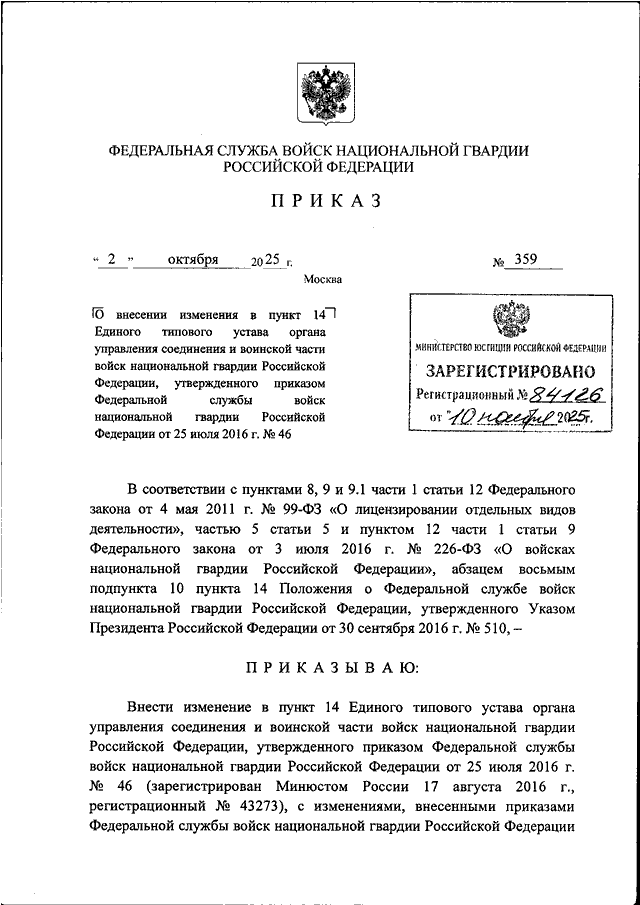 ПРИКАЗ Росгвардии от 02.10.2025 N 359