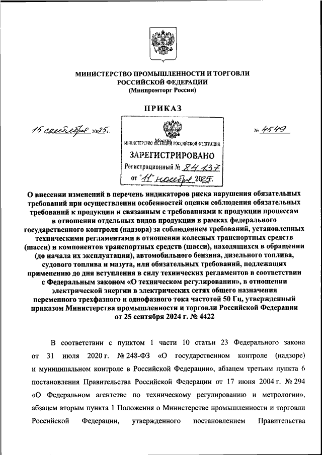 ПРИКАЗ Минпромторга РФ от 15.09.2025 N 4549
