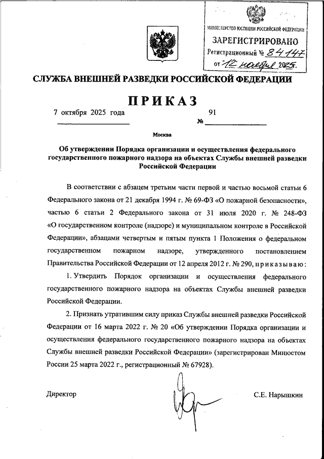 ПРИКАЗ СВР РФ от 07.10.2025 N 91