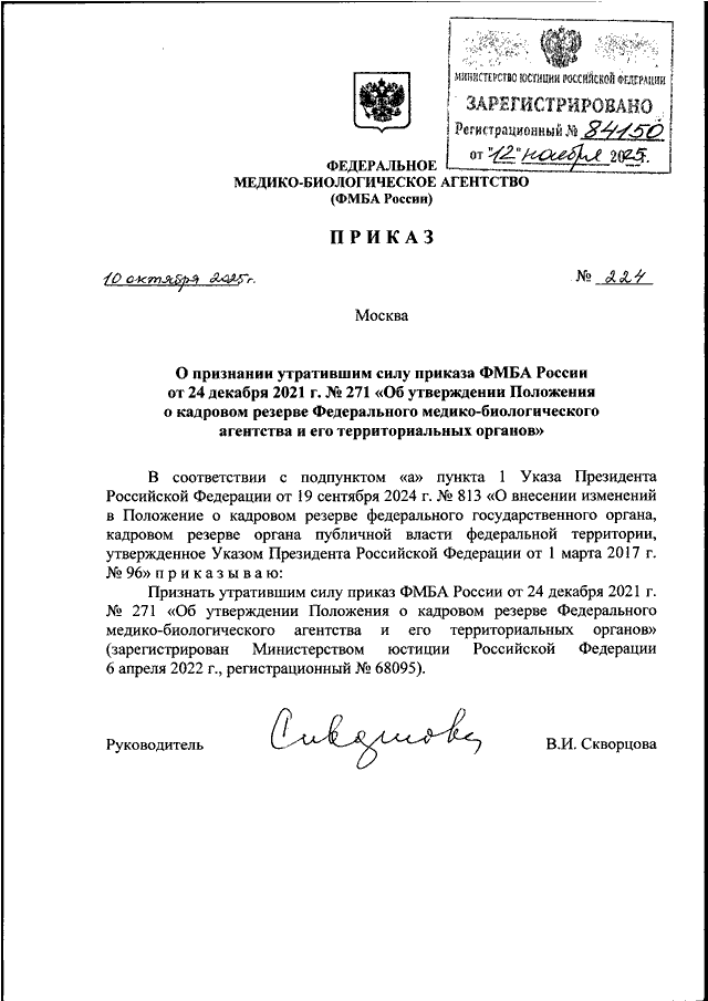 ПРИКАЗ ФМБА РФ от 10.10.2025 N 224