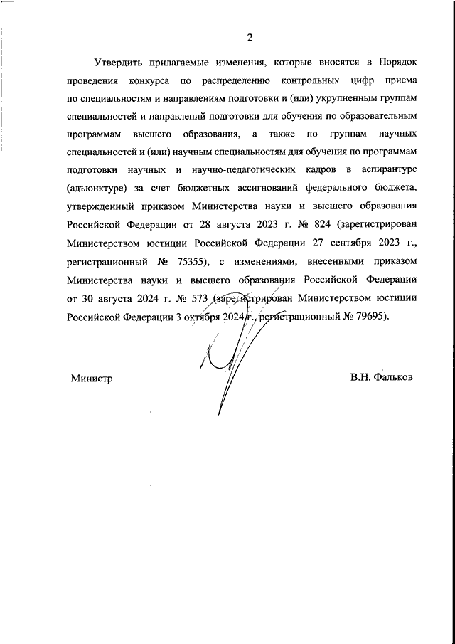 "О ВНЕСЕНИИ ИЗМЕНЕНИЙ В ПОРЯДОК ПРОВЕДЕНИЯ КОНКУРСА ПО РАСПРЕДЕЛЕНИЮ КОНТРОЛЬНЫХ ЦИФР ПРИЕМА ПО СПЕЦИАЛЬНОСТЯМ И НАПРАВЛЕНИЯМ ПОДГОТОВКИ И (ИЛИ) УКРУПНЕННЫМ ГРУППАМ СПЕЦИАЛЬНОСТЕЙ И НАПРАВЛЕНИЙ ПОДГОТОВКИ ДЛЯ ОБУЧЕНИЯ ПО ОБРАЗОВАТЕЛЬНЫМ ПРОГРАММАМ ВЫСШЕГО ОБРАЗОВАНИЯ, А ТАКЖЕ ПО ГРУППАМ НАУЧНЫХ СПЕЦИАЛЬНОСТЕЙ И (ИЛИ) НАУЧНЫМ СПЕЦИАЛЬНОСТЯМ ДЛЯ ОБУЧЕНИЯ ПО ПРОГРАММАМ ПОДГОТОВКИ НАУЧНЫХ И НАУЧНО - ПЕДАГОГИЧЕСКИХ КАДРОВ В АСПИРАНТУРЕ (АДЪЮНКТУРЕ) ЗА СЧЕТ БЮДЖЕТНЫХ АССИГНОВАНИЙ ФЕДЕРАЛЬНОГО БЮДЖЕТА, УТВЕРЖДЕННЫЙ ПРИКАЗОМ МИНИСТЕРСТВА НАУКИ И ВЫСШЕГО ОБРАЗОВАНИЯ РОССИЙСКОЙ ФЕДЕРАЦИИ ОТ 28 АВГУСТА 2023 Г. N 824"