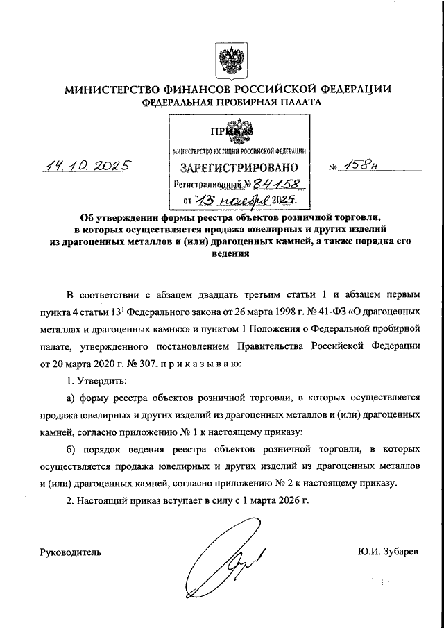 ПРИКАЗ Федеральной пробирной палаты от 14.10.2025 N 158н