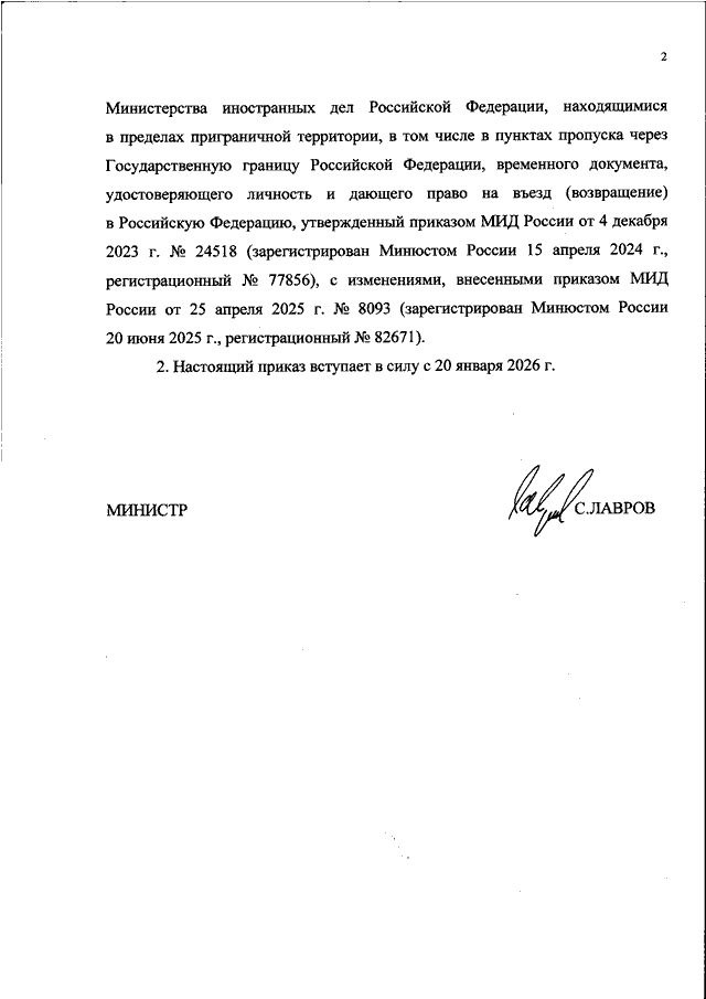 "О ВНЕСЕНИИ ИЗМЕНЕНИЙ В ПОРЯДОК ОФОРМЛЕНИЯ ДИПЛОМАТИЧЕСКИМИ ПРЕДСТАВИТЕЛЬСТВАМИ ИЛИ КОНСУЛЬСКИМИ УЧРЕЖДЕНИЯМИ РОССИЙСКОЙ ФЕДЕРАЦИИ ЛИБО ПРЕДСТАВИТЕЛЬСТВАМИ МИНИСТЕРСТВА ИНОСТРАННЫХ ДЕЛ РОССИЙСКОЙ ФЕДЕРАЦИИ, НАХОДЯЩИМИСЯ В ПРЕДЕЛАХ ПРИГРАНИЧНОЙ ТЕРРИТОРИИ, В ТОМ ЧИСЛЕ В ПУНКТАХ ПРОПУСКА ЧЕРЕЗ ГОСУДАРСТВЕННУЮ ГРАНИЦУ РОССИЙСКОЙ ФЕДЕРАЦИИ, ВРЕМЕННОГО ДОКУМЕНТА, УДОСТОВЕРЯЮЩЕГО ЛИЧНОСТЬ И ДАЮЩЕГО ПРАВО НА ВЪЕЗД (ВОЗВРАЩЕНИЕ) В РОССИЙСКУЮ ФЕДЕРАЦИЮ, УТВЕРЖДЕННЫЙ ПРИКАЗОМ МИД РОССИИ ОТ 4 ДЕКАБРЯ 2023 Г. N 24518"