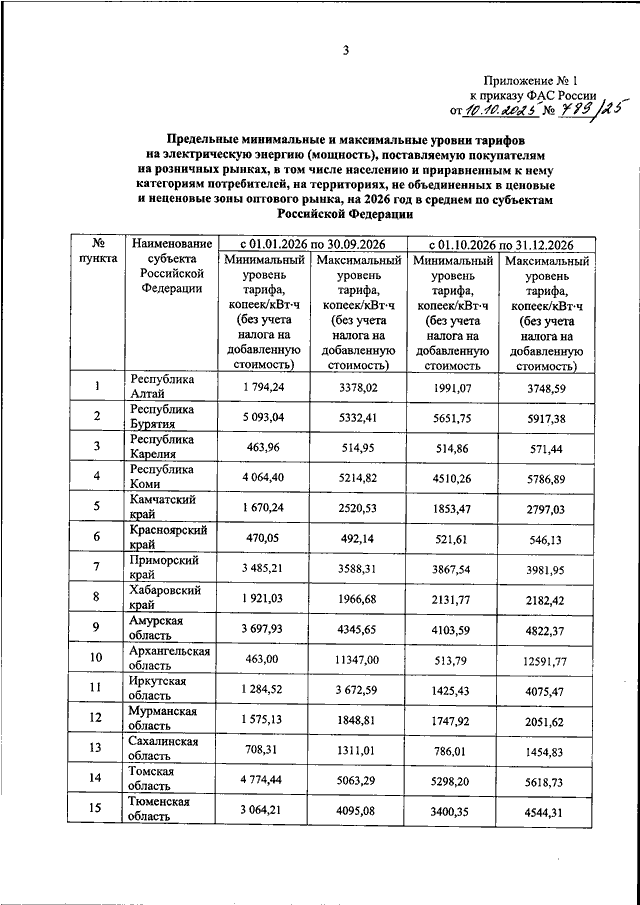 "О ПРЕДЕЛЬНЫХ МИНИМАЛЬНЫХ И МАКСИМАЛЬНЫХ УРОВНЯХ ТАРИФОВ НА ЭЛЕКТРИЧЕСКУЮ ЭНЕРГИЮ (МОЩНОСТЬ), ПОСТАВЛЯЕМУЮ ПОКУПАТЕЛЯМ НА РОЗНИЧНЫХ РЫНКАХ, В ТОМ ЧИСЛЕ НАСЕЛЕНИЮ И ПРИРАВНЕННЫМ К НЕМУ КАТЕГОРИЯМ ПОТРЕБИТЕЛЕЙ, НА ТЕРРИТОРИЯХ, НЕ ОБЪЕДИНЕННЫХ В ЦЕНОВЫЕ И НЕЦЕНОВЫЕ ЗОНЫ ОПТОВОГО РЫНКА, НА 2026 ГОД В СРЕДНЕМ ПО СУБЪЕКТАМ РОССИЙСКОЙ ФЕДЕРАЦИИ И ДЛЯ ГАРАНТИРУЮЩИХ ПОСТАВЩИКОВ РЕСПУБЛИКИ САХА (ЯКУТИЯ), ЗАБАЙКАЛЬСКОГО КРАЯ И МАГАДАНСКОЙ ОБЛАСТИ"