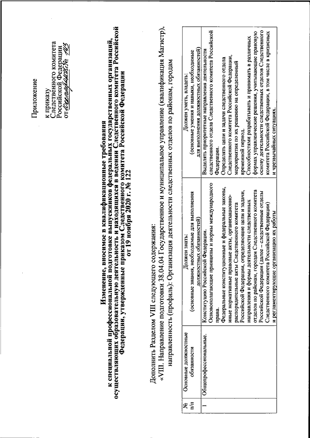 "О ВНЕСЕНИИ ИЗМЕНЕНИЯ В КВАЛИФИКАЦИОННЫЕ ТРЕБОВАНИЯ К СПЕЦИАЛЬНОЙ ПРОФЕССИОНАЛЬНОЙ ПОДГОТОВКЕ ВЫПУСКНИКОВ ФЕДЕРАЛЬНЫХ ГОСУДАРСТВЕННЫХ ОРГАНИЗАЦИЙ, ОСУЩЕСТВЛЯЮЩИХ ОБРАЗОВАТЕЛЬНУЮ ДЕЯТЕЛЬНОСТЬ И НАХОДЯЩИХСЯ В ВЕДЕНИИ СЛЕДСТВЕННОГО КОМИТЕТА РОССИЙСКОЙ ФЕДЕРАЦИИ, УТВЕРЖДЕННЫЕ ПРИКАЗОМ СЛЕДСТВЕННОГО КОМИТЕТА РОССИЙСКОЙ ФЕДЕРАЦИИ ОТ 19 НОЯБРЯ 2020 Г. N 122"