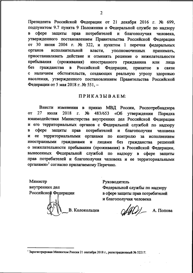 "О ВНЕСЕНИИ ИЗМЕНЕНИЙ В ПРИКАЗ МВД РОССИИ, РОСПОТРЕБНАДЗОРА ОТ 27 ИЮЛЯ 2018 Г. N 483/653 "ОБ УТВЕРЖДЕНИИ ПОРЯДКА ВЗАИМОДЕЙСТВИЯ МИНИСТЕРСТВА ВНУТРЕННИХ ДЕЛ РОССИЙСКОЙ ФЕДЕРАЦИИ И ЕГО ТЕРРИТОРИАЛЬНЫХ ОРГАНОВ С ФЕДЕРАЛЬНОЙ СЛУЖБОЙ ПО НАДЗОРУ В СФЕРЕ ЗАЩИТЫ ПРАВ ПОТРЕБИТЕЛЕЙ И БЛАГОПОЛУЧИЯ ЧЕЛОВЕКА И ЕЕ ТЕРРИТОРИАЛЬНЫМИ ОРГАНАМИ ПО КОНТРОЛЮ ЗА ИСПОЛНЕНИЕМ ИНОСТРАННЫМИ ГРАЖДАНАМИ И ЛИЦАМИ БЕЗ ГРАЖДАНСТВА РЕШЕНИЙ О НЕЖЕЛАТЕЛЬНОСТИ ПРЕБЫВАНИЯ (ПРОЖИВАНИЯ) В РОССИЙСКОЙ ФЕДЕРАЦИИ, ВЫНЕСЕННЫХ ФЕДЕРАЛЬНОЙ СЛУЖБОЙ ПО НАДЗОРУ В СФЕРЕ ЗАЩИТЫ ПРАВ ПОТРЕБИТЕЛЕЙ И БЛАГОПОЛУЧИЯ ЧЕЛОВЕКА И ЕЕ ТЕРРИТОРИАЛЬНЫМИ ОРГАНАМИ"