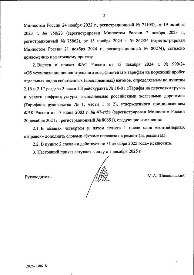 "О ВНЕСЕНИИ ИЗМЕНЕНИЙ В ПРИКАЗ ФАС РОССИИ ОТ 10 ДЕКАБРЯ 2015 Г. N 1226/15 "ОБ ИНДЕКСАЦИИ СТАВОК ТАРИФОВ, СБОРОВ И ПЛАТЫ ЗА ПЕРЕВОЗКУ ГРУЗОВ И УСЛУГИ ПО ИСПОЛЬЗОВАНИЮ ИНФРАСТРУКТУРЫ ПРИ ПЕРЕВОЗКАХ ГРУЗОВ, ВЫПОЛНЯЕМЫЕ (ОКАЗЫВАЕМЫЕ) ОАО "РОССИЙСКИЕ ЖЕЛЕЗНЫЕ ДОРОГИ" И В ПРИКАЗ ФАС РОССИИ ОТ 13 ДЕКАБРЯ 2024 Г. N 999/24 "ОБ УСТАНОВЛЕНИИ ДОПОЛНИТЕЛЬНОГО КОЭФФИЦИЕНТА К ТАРИФАМ НА ПОРОЖНИЙ ПРОБЕГ ОТДЕЛЬНЫХ ВИДОВ СОБСТВЕННЫХ (АРЕНДОВАННЫХ) ВАГОНОВ, ОПРЕДЕЛЯЕМЫМ ПО ПУНКТАМ 2.16 И 2.17 РАЗДЕЛА 2 ЧАСТИ 1 ПРЕЙСКУРАНТА N 10-01 "ТАРИФЫ НА ПЕРЕВОЗКИ ГРУЗОВ И УСЛУГИ ИНФРАСТРУКТУРЫ, ВЫПОЛНЯЕМЫЕ РОССИЙСКИМИ ЖЕЛЕЗНЫМИ ДОРОГАМИ" (ТАРИФНОЕ РУКОВОДСТВО N 1, ЧАСТИ 1 И 2), УТВЕРЖДЕННОГО ПОСТАНОВЛЕНИЕМ ФЭК РОССИИ ОТ 17 ИЮНЯ 2003 Г. N 47-Т/5"