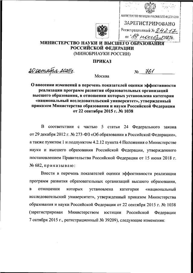 ПРИКАЗ Минобрнауки РФ от 20.10.2025 N 761