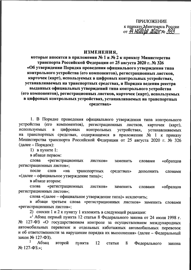 "О ВНЕСЕНИИ ИЗМЕНЕНИЙ В ПРИЛОЖЕНИЯ N 1 И N 2 К ПРИКАЗУ МИНИСТЕРСТВА ТРАНСПОРТА РОССИЙСКОЙ ФЕДЕРАЦИИ ОТ 25 АВГУСТА 2020 Г. N 326"