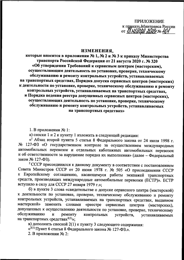 "О ВНЕСЕНИИ ИЗМЕНЕНИЙ В ПРИЛОЖЕНИЯ N 1, N 2 И N 3 К ПРИКАЗУ МИНИСТЕРСТВА ТРАНСПОРТА РОССИЙСКОЙ ФЕДЕРАЦИИ ОТ 21 АВГУСТА 2020 Г. N 320"
