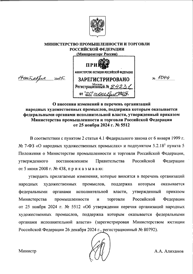 "О ВНЕСЕНИИ ИЗМЕНЕНИЙ В ПЕРЕЧЕНЬ ОРГАНИЗАЦИЙ НАРОДНЫХ ХУДОЖЕСТВЕННЫХ ПРОМЫСЛОВ, ПОДДЕРЖКА КОТОРЫМ ОКАЗЫВАЕТСЯ ФЕДЕРАЛЬНЫМИ ОРГАНАМИ ИСПОЛНИТЕЛЬНОЙ ВЛАСТИ, УТВЕРЖДЕННЫЙ ПРИКАЗОМ МИНИСТЕРСТВА ПРОМЫШЛЕННОСТИ И ТОРГОВЛИ РОССИЙСКОЙ ФЕДЕРАЦИИ ОТ 25 НОЯБРЯ 2024 Г. N 5512"