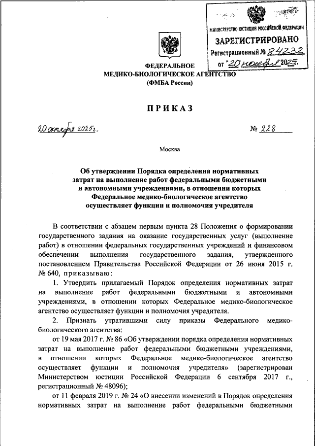 ПРИКАЗ ФМБА РФ от 20.10.2025 N 228