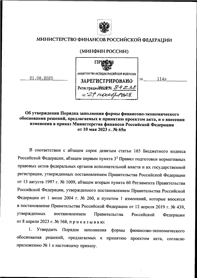 "ОБ УТВЕРЖДЕНИИ ПОРЯДКА ЗАПОЛНЕНИЯ ФОРМЫ ФИНАНСОВО - ЭКОНОМИЧЕСКОГО ОБОСНОВАНИЯ РЕШЕНИЙ, ПРЕДЛАГАЕМЫХ К ПРИНЯТИЮ ПРОЕКТОМ АКТА, И О ВНЕСЕНИИ ИЗМЕНЕНИЯ В ПРИКАЗ МИНИСТЕРСТВА ФИНАНСОВ РОССИЙСКОЙ ФЕДЕРАЦИИ ОТ 10 МАЯ 2023 Г. N 65Н"
