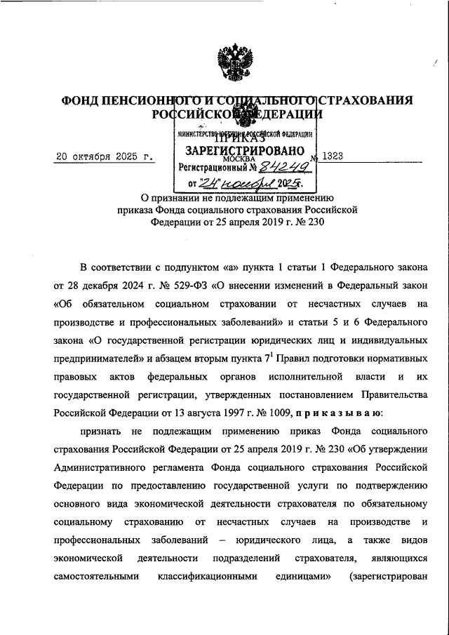 "О ПРИЗНАНИИ НЕ ПОДЛЕЖАЩИМ ПРИМЕНЕНИЮ ПРИКАЗА ФОНДА СОЦИАЛЬНОГО СТРАХОВАНИЯ РОССИЙСКОЙ ФЕДЕРАЦИИ ОТ 25 АПРЕЛЯ 2019 Г. N 230"