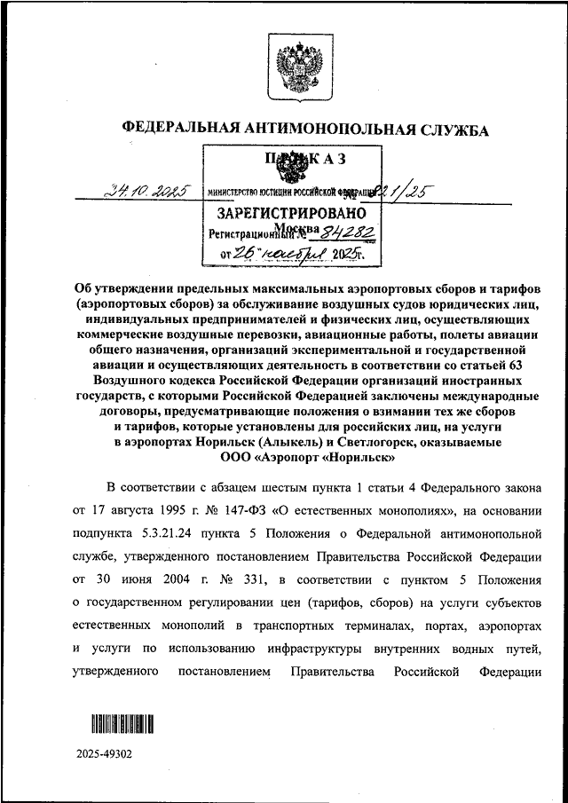 "ОБ УТВЕРЖДЕНИИ ПРЕДЕЛЬНЫХ МАКСИМАЛЬНЫХ АЭРОПОРТОВЫХ СБОРОВ И ТАРИФОВ (АЭРОПОРТОВЫХ СБОРОВ) ЗА ОБСЛУЖИВАНИЕ ВОЗДУШНЫХ СУДОВ ЮРИДИЧЕСКИХ ЛИЦ, ИНДИВИДУАЛЬНЫХ ПРЕДПРИНИМАТЕЛЕЙ И ФИЗИЧЕСКИХ ЛИЦ, ОСУЩЕСТВЛЯЮЩИХ КОММЕРЧЕСКИЕ ВОЗДУШНЫЕ ПЕРЕВОЗКИ, АВИАЦИОННЫЕ РАБОТЫ, ПОЛЕТЫ АВИАЦИИ ОБЩЕГО НАЗНАЧЕНИЯ, ОРГАНИЗАЦИЙ ЭКСПЕРИМЕНТАЛЬНОЙ И ГОСУДАРСТВЕННОЙ АВИАЦИИ И ОСУЩЕСТВЛЯЮЩИХ ДЕЯТЕЛЬНОСТЬ В СООТВЕТСТВИИ СО СТАТЬЕЙ 63 ВОЗДУШНОГО КОДЕКСА РОССИЙСКОЙ ФЕДЕРАЦИИ ОРГАНИЗАЦИЙ ИНОСТРАННЫХ ГОСУДАРСТВ, С КОТОРЫМИ РОССИЙСКОЙ ФЕДЕРАЦИЕЙ ЗАКЛЮЧЕНЫ МЕЖДУНАРОДНЫЕ ДОГОВОРЫ, ПРЕДУСМАТРИВАЮЩИЕ ПОЛОЖЕНИЯ О ВЗИМАНИИ ТЕХ ЖЕ СБОРОВ И ТАРИФОВ, КОТОРЫЕ УСТАНОВЛЕНЫ ДЛЯ РОССИЙСКИХ ЛИЦ, НА УСЛУГИ В АЭРОПОРТАХ НОРИЛЬСК (АЛЫКЕЛЬ) И СВЕТЛОГОРСК, ОКАЗЫВАЕМЫЕ ООО "АЭРОПОРТ "НОРИЛЬСК"
