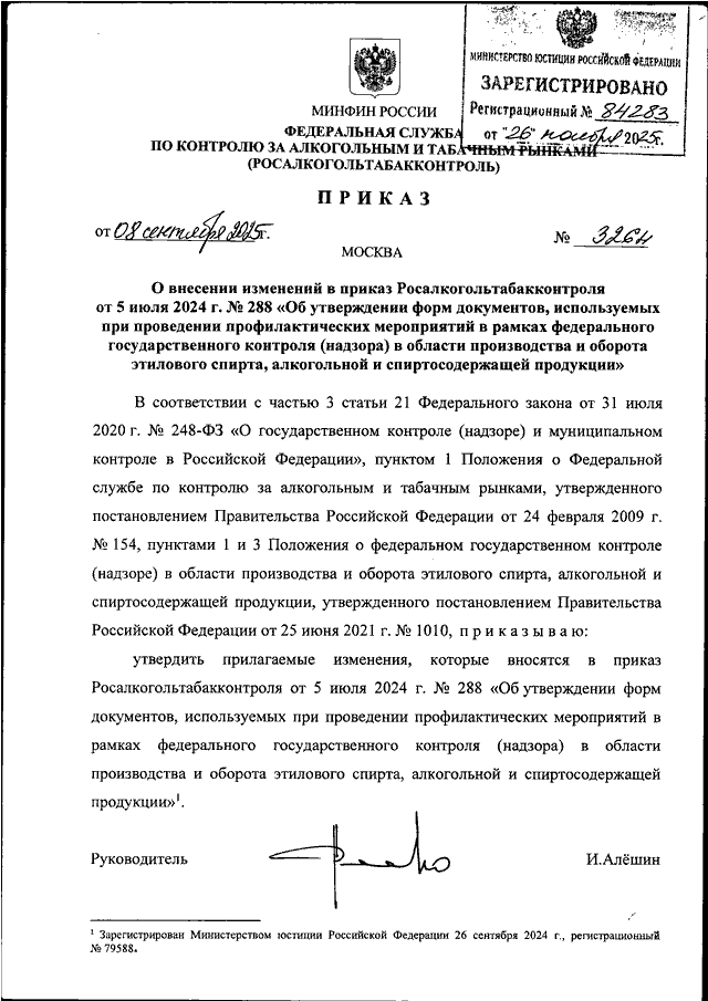 "О ВНЕСЕНИИ ИЗМЕНЕНИЙ В ПРИКАЗ РОСАЛКОГОЛЬТАБАККОНТРОЛЯ ОТ 5 ИЮЛЯ 2024 Г. N 288 "ОБ УТВЕРЖДЕНИИ ФОРМ ДОКУМЕНТОВ, ИСПОЛЬЗУЕМЫХ ПРИ ПРОВЕДЕНИИ ПРОФИЛАКТИЧЕСКИХ МЕРОПРИЯТИЙ В РАМКАХ ФЕДЕРАЛЬНОГО ГОСУДАРСТВЕННОГО КОНТРОЛЯ (НАДЗОРА) В ОБЛАСТИ ПРОИЗВОДСТВА И ОБОРОТА ЭТИЛОВОГО СПИРТА, АЛКОГОЛЬНОЙ И СПИРТОСОДЕРЖАЩЕЙ ПРОДУКЦИИ"
