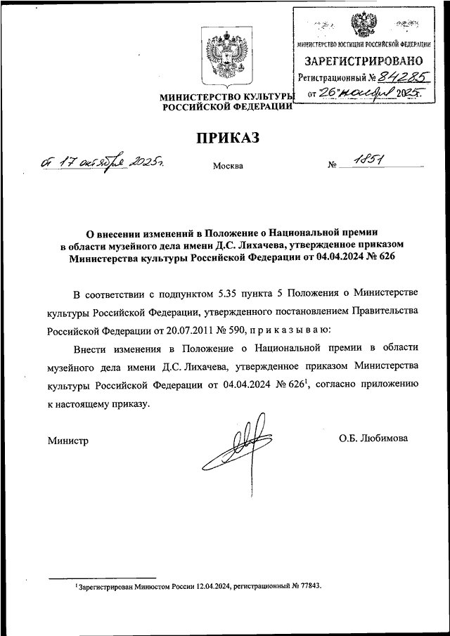 МИНИСТЕРСТВА КУЛЬТУРЫ РОССИЙСКОЙ ФЕДЕРАЦИИ ОТ 04.04.2024 N 626"