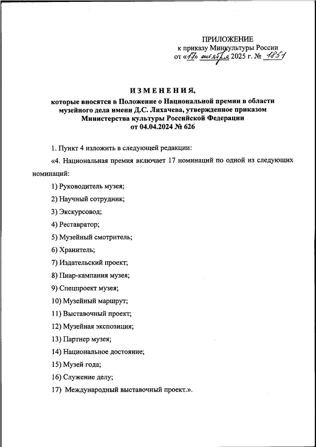 "О ВНЕСЕНИИ ИЗМЕНЕНИЙ В ПОЛОЖЕНИЕ О НАЦИОНАЛЬНОЙ ПРЕМИИ В ОБЛАСТИ МУЗЕЙНОГО ДЕЛА ИМЕНИ Д.С. ЛИХАЧЕВА, УТВЕРЖДЕННОЕ ПРИКАЗОМ МИНИСТЕРСТВА КУЛЬТУРЫ РОССИЙСКОЙ ФЕДЕРАЦИИ ОТ 04.04.2024 N 626"