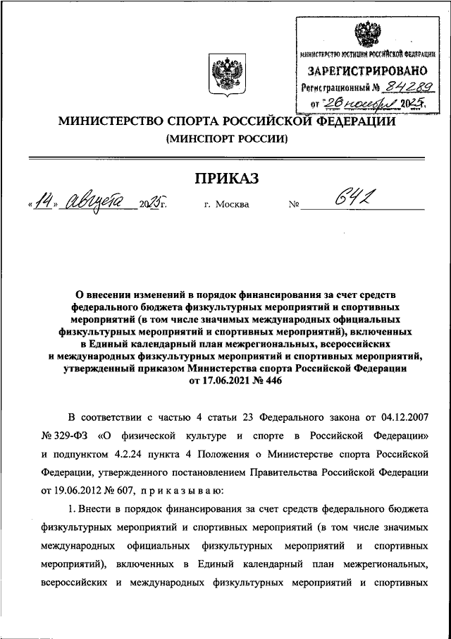 ПРИКАЗ Минспорта РФ от 14.08.2025 N 642