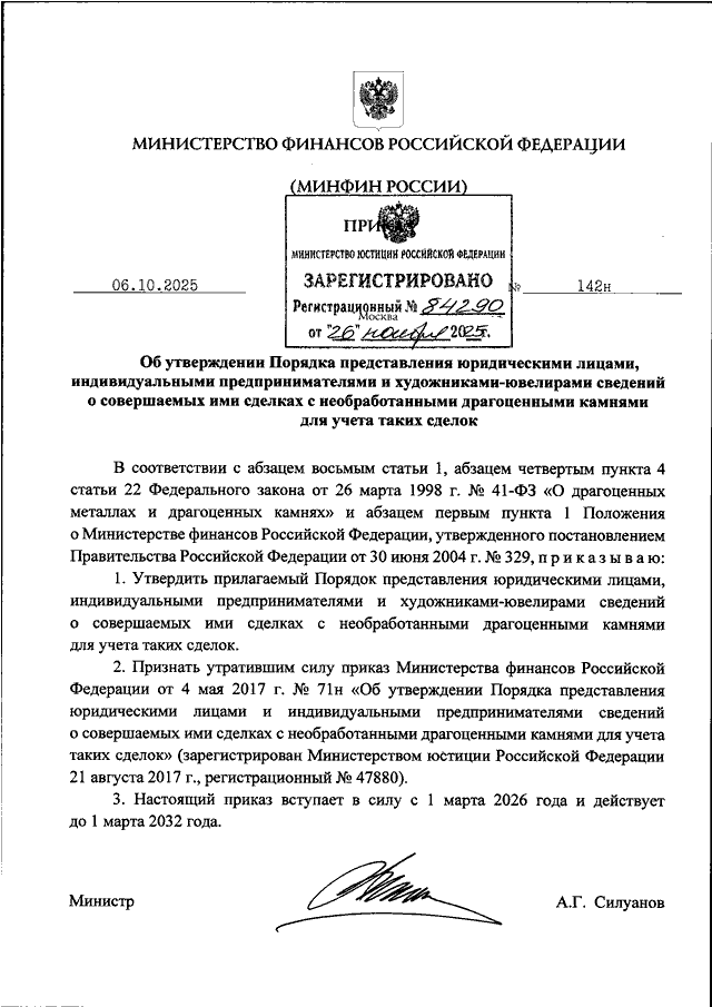 ПРИКАЗ Минфина РФ от 06.10.2025 N 142н