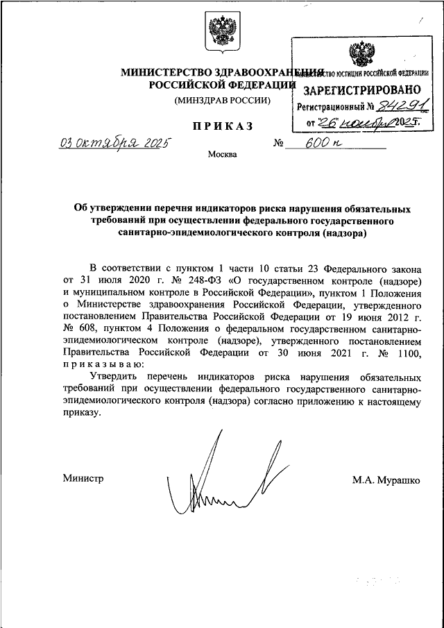 ПРИКАЗ Минздрава РФ от 03.10.2025 N 600н