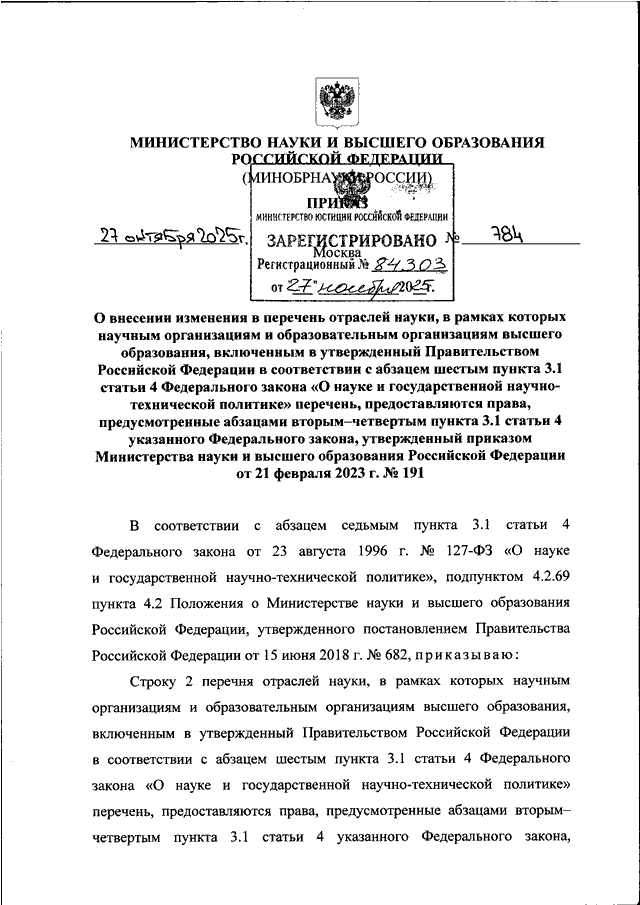 ПРИКАЗ Минобрнауки РФ от 27.10.2025 N 784