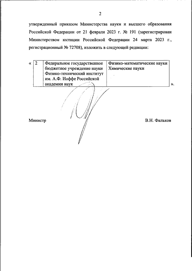 "О ВНЕСЕНИИ ИЗМЕНЕНИЯ В ПЕРЕЧЕНЬ ОТРАСЛЕЙ НАУКИ, В РАМКАХ КОТОРЫХ НАУЧНЫМ ОРГАНИЗАЦИЯМ И ОБРАЗОВАТЕЛЬНЫМ ОРГАНИЗАЦИЯМ ВЫСШЕГО ОБРАЗОВАНИЯ, ВКЛЮЧЕННЫМ В УТВЕРЖДЕННЫЙ ПРАВИТЕЛЬСТВОМ РОССИЙСКОЙ ФЕДЕРАЦИИ В СООТВЕТСТВИИ С АБЗАЦЕМ ШЕСТЫМ ПУНКТА 3.1 СТАТЬИ 4 ФЕДЕРАЛЬНОГО ЗАКОНА "О НАУКЕ И ГОСУДАРСТВЕННОЙ НАУЧНО - ТЕХНИЧЕСКОЙ ПОЛИТИКЕ" ПЕРЕЧЕНЬ, ПРЕДОСТАВЛЯЮТСЯ ПРАВА, ПРЕДУСМОТРЕННЫЕ АБЗАЦАМИ ВТОРЫМ - ЧЕТВЕРТЫМ ПУНКТА 3.1 СТАТЬИ 4 УКАЗАННОГО ФЕДЕРАЛЬНОГО ЗАКОНА, УТВЕРЖДЕННЫЙ ПРИКАЗОМ МИНИСТЕРСТВА НАУКИ И ВЫСШЕГО ОБРАЗОВАНИЯ РОССИЙСКОЙ ФЕДЕРАЦИИ ОТ 21 ФЕВРАЛЯ 2023 Г. N 191"
