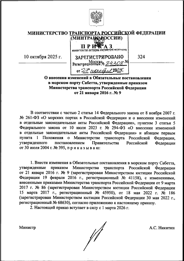 ПРИКАЗ Минтранса РФ от 10.10.2025 N 324