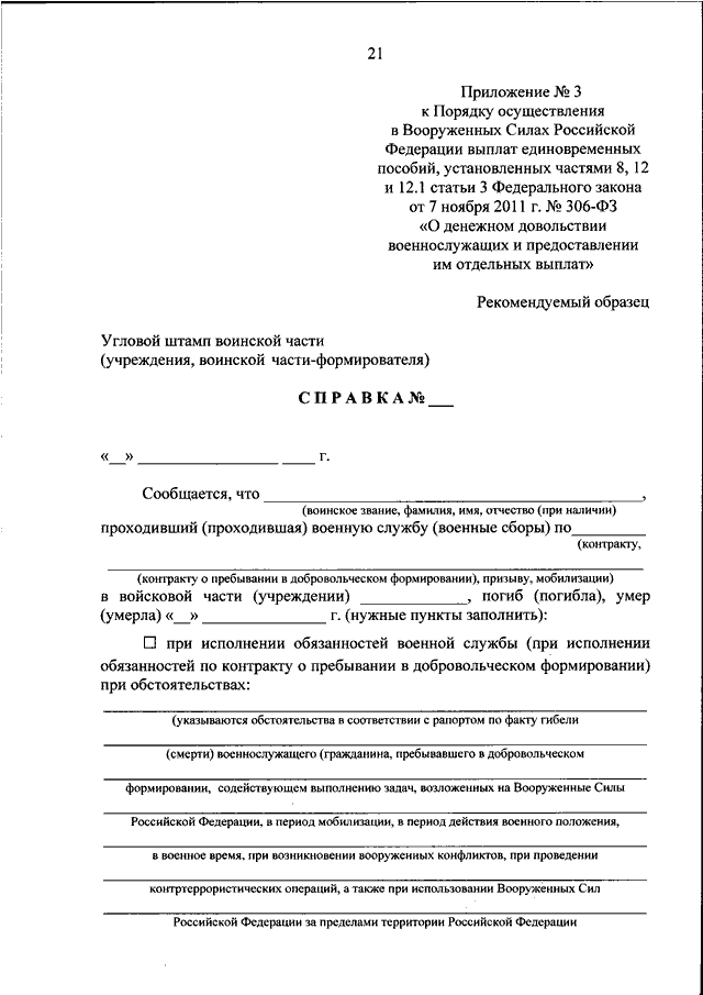 "ОБ ОПРЕДЕЛЕНИИ ПОРЯДКА ОСУЩЕСТВЛЕНИЯ В ВООРУЖЕННЫХ СИЛАХ РОССИЙСКОЙ ФЕДЕРАЦИИ ВЫПЛАТ ЕДИНОВРЕМЕННЫХ ПОСОБИЙ, УСТАНОВЛЕННЫХ ЧАСТЯМИ 8, 12 И 12.1 СТАТЬИ 3 ФЕДЕРАЛЬНОГО ЗАКОНА ОТ 7 НОЯБРЯ 2011 Г. N 306-ФЗ "О ДЕНЕЖНОМ ДОВОЛЬСТВИИ ВОЕННОСЛУЖАЩИХ И ПРЕДОСТАВЛЕНИИ ИМ ОТДЕЛЬНЫХ ВЫПЛАТ"