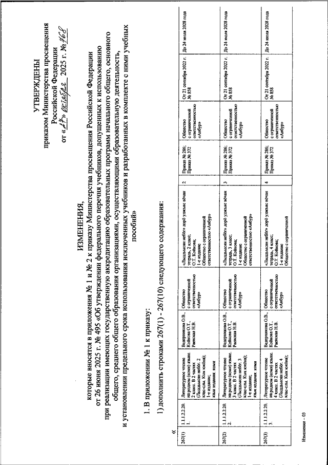 "О ВНЕСЕНИИ ИЗМЕНЕНИЙ В ПРИЛОЖЕНИЯ N 1 И N 2 К ПРИКАЗУ МИНИСТЕРСТВА ПРОСВЕЩЕНИЯ РОССИЙСКОЙ ФЕДЕРАЦИИ ОТ 26 ИЮНЯ 2025 Г. N 495 "ОБ УТВЕРЖДЕНИИ ФЕДЕРАЛЬНОГО ПЕРЕЧНЯ УЧЕБНИКОВ, ДОПУЩЕННЫХ К ИСПОЛЬЗОВАНИЮ ПРИ РЕАЛИЗАЦИИ ИМЕЮЩИХ ГОСУДАРСТВЕННУЮ АККРЕДИТАЦИЮ ОБРАЗОВАТЕЛЬНЫХ ПРОГРАММ НАЧАЛЬНОГО ОБЩЕГО, ОСНОВНОГО ОБЩЕГО, СРЕДНЕГО ОБЩЕГО ОБРАЗОВАНИЯ ОРГАНИЗАЦИЯМИ, ОСУЩЕСТВЛЯЮЩИМИ ОБРАЗОВАТЕЛЬНУЮ ДЕЯТЕЛЬНОСТЬ, И УСТАНОВЛЕНИИ ПРЕДЕЛЬНОГО СРОКА ИСПОЛЬЗОВАНИЯ ИСКЛЮЧЕННЫХ УЧЕБНИКОВ И РАЗРАБОТАННЫХ В КОМПЛЕКТЕ С НИМИ УЧЕБНЫХ ПОСОБИЙ"