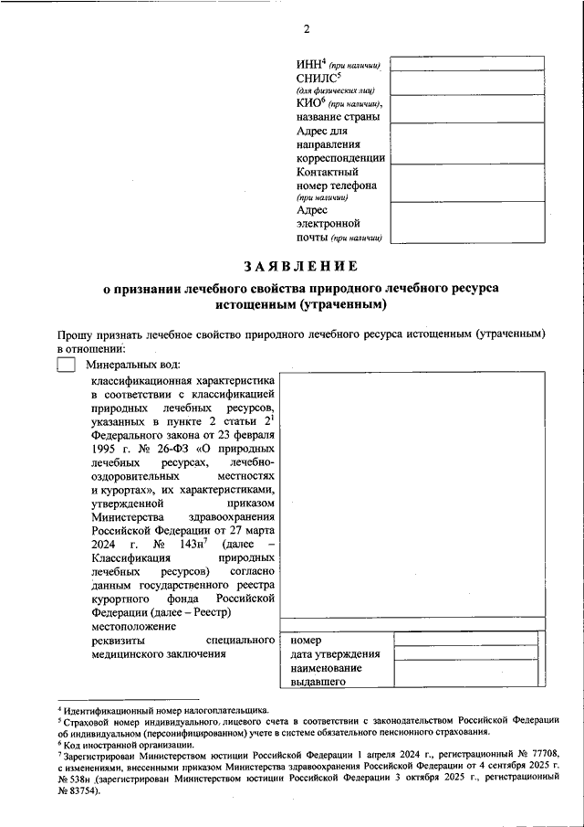 "ОБ УТВЕРЖДЕНИИ ФОРМЫ ЗАЯВЛЕНИЯ О ПРИЗНАНИИ ЛЕЧЕБНОГО СВОЙСТВА ПРИРОДНОГО ЛЕЧЕБНОГО РЕСУРСА ИСТОЩЕННЫМ (УТРАЧЕННЫМ)"