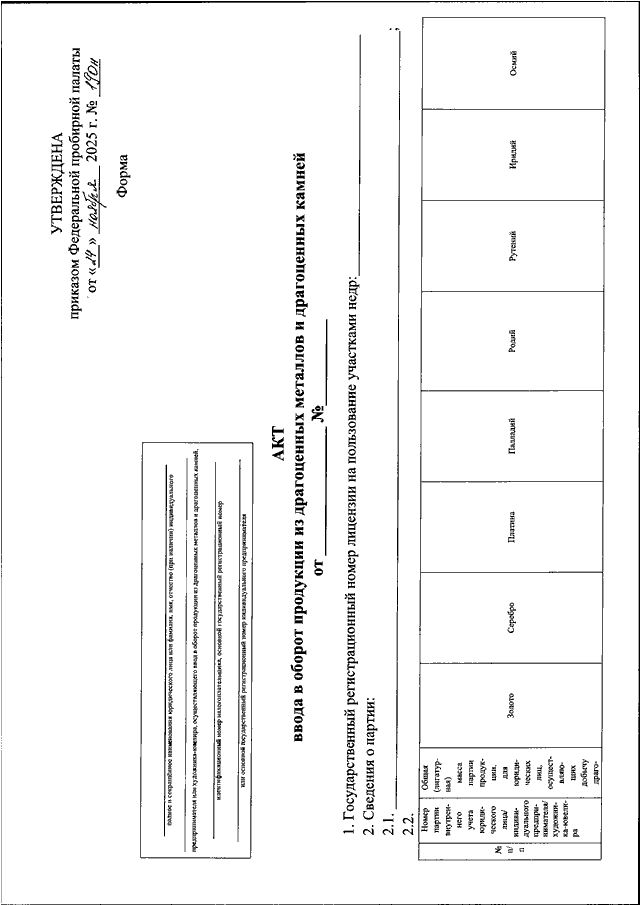 "ОБ УТВЕРЖДЕНИИ ФОРМЫ АКТА ВВОДА В ОБОРОТ ПРОДУКЦИИ ИЗ ДРАГОЦЕННЫХ МЕТАЛЛОВ И ДРАГОЦЕННЫХ КАМНЕЙ"