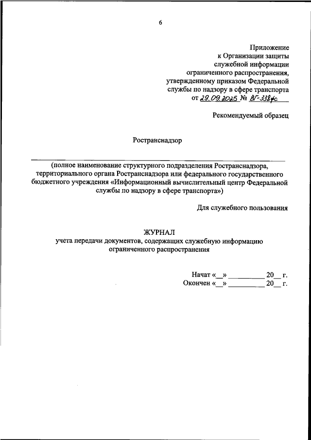 "ОБ УПОРЯДОЧЕНИИ ОБРАЩЕНИЯ СО СЛУЖЕБНОЙ ИНФОРМАЦИЕЙ ОГРАНИЧЕННОГО РАСПРОСТРАНЕНИЯ В ФЕДЕРАЛЬНОЙ СЛУЖБЕ ПО НАДЗОРУ В СФЕРЕ ТРАНСПОРТА, ЕЕ ТЕРРИТОРИАЛЬНЫХ ОРГАНАХ И ФЕДЕРАЛЬНОМ ГОСУДАРСТВЕННОМ БЮДЖЕТНОМ УЧРЕЖДЕНИИ "ИНФОРМАЦИОННЫЙ ВЫЧИСЛИТЕЛЬНЫЙ ЦЕНТР ФЕДЕРАЛЬНОЙ СЛУЖБЫ ПО НАДЗОРУ В СФЕРЕ ТРАНСПОРТА"