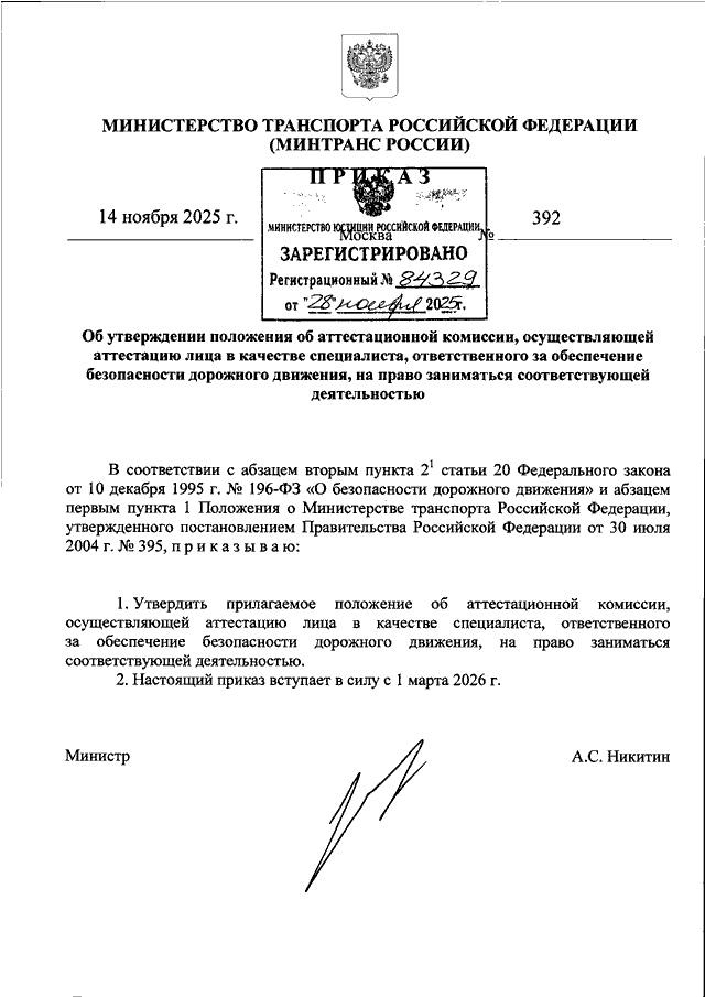 ПРИКАЗ Минтранса РФ от 14.11.2025 N 392