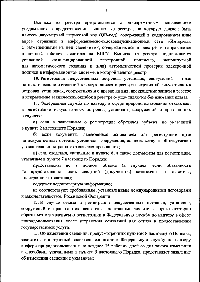 "ОБ УТВЕРЖДЕНИИ ПОРЯДКА РЕГИСТРАЦИИ ИСКУССТВЕННЫХ ОСТРОВОВ, УСТАНОВОК, СООРУЖЕНИЙ, РАСПОЛОЖЕННЫХ НА КОНТИНЕНТАЛЬНОМ ШЕЛЬФЕ РОССИЙСКОЙ ФЕДЕРАЦИИ, И ПРАВ НА НИХ, ИСКУССТВЕННЫХ ОСТРОВОВ, УСТАНОВОК, СООРУЖЕНИЙ (ЗА ИСКЛЮЧЕНИЕМ ПЛАВУЧИХ (ПОДВИЖНЫХ) БУРОВЫХ УСТАНОВОК (ПЛАТФОРМ), МОРСКИХ ПЛАВУЧИХ (ПЕРЕДВИЖНЫХ) ПЛАТФОРМ), РАСПОЛОЖЕННЫХ ВО ВНУТРЕННИХ МОРСКИХ ВОДАХ РОССИЙСКОЙ ФЕДЕРАЦИИ, В ТЕРРИТОРИАЛЬНОМ МОРЕ РОССИЙСКОЙ ФЕДЕРАЦИИ И В ПРЕДЕЛАХ РОССИЙСКОГО СЕКТОРА КАСПИЙСКОГО МОРЯ, И ПРАВ НА НИХ В РЕЕСТРЕ ИСКУССТВЕННЫХ ОСТРОВОВ, УСТАНОВОК, СООРУЖЕНИЙ И ПРАВ НИХ, А ТАКЖЕ ВНЕСЕНИЯ В НЕГО ИНФОРМАЦИИ ОБ ИЗМЕНЕНИИ СВЕДЕНИЙ О РАНЕЕ ЗАРЕГИСТРИРОВАННЫХ УКАЗАННЫХ ИСКУССТВЕННЫХ ОСТРОВАХ, УСТАНОВКАХ, СООРУЖЕНИЯХ И ПРАВАХ НА НИХ, О ПРЕКРАЩЕНИИ ЗАПИСИ И ОБ ИСПРАВЛЕНИИ В НЕМ ТЕХНИЧЕСКИХ ОШИБОК ЛИБО ОТКАЗА В ОСУЩЕСТВЛЕНИИ УКАЗАННЫХ ПРОЦЕДУР, А ТАКЖЕ ПРЕДОСТАВЛЕНИЯ ИЗ УКАЗАННОГО РЕЕСТРА СВЕДЕНИЙ"